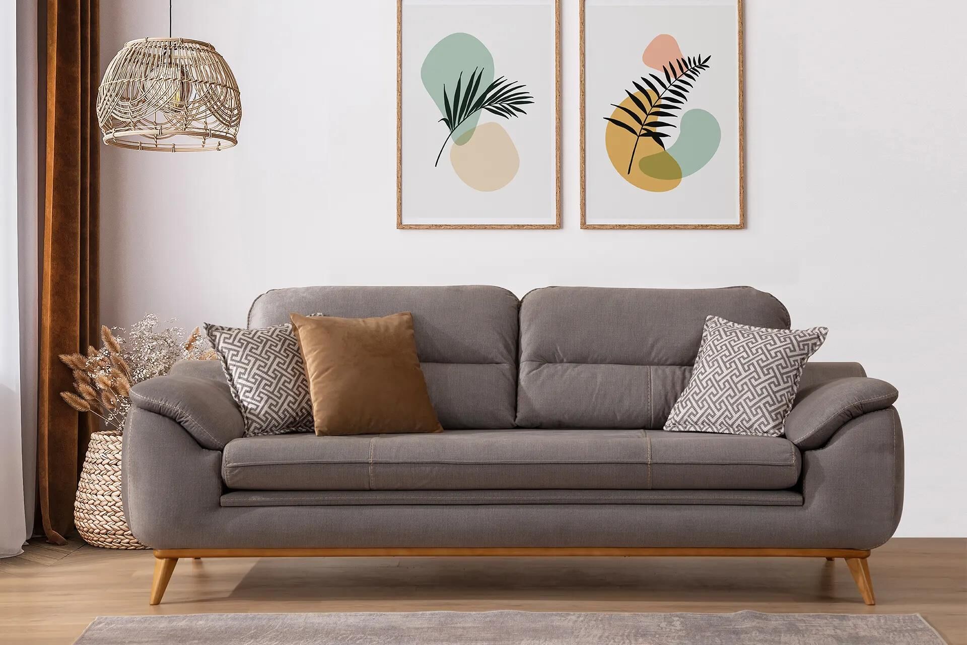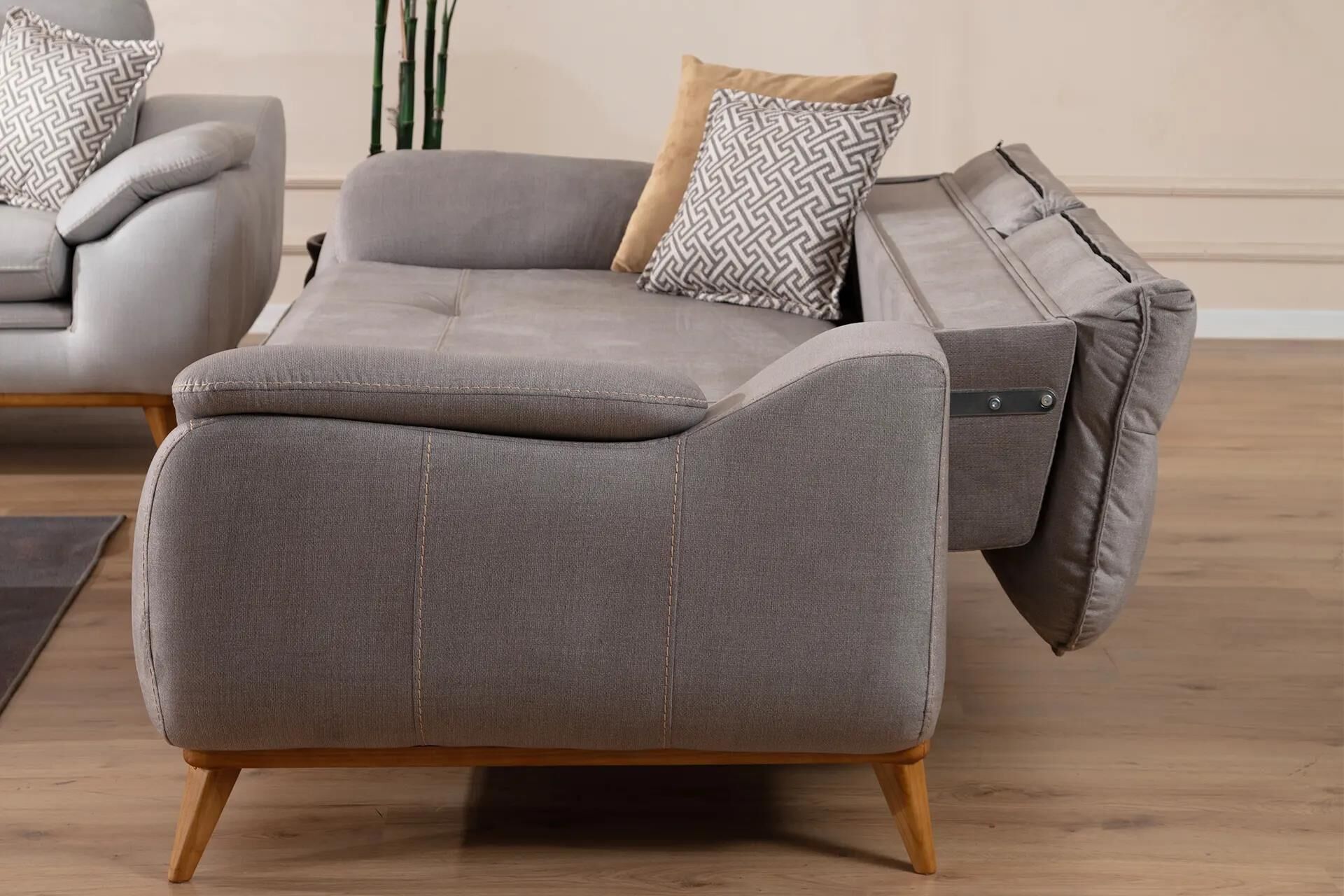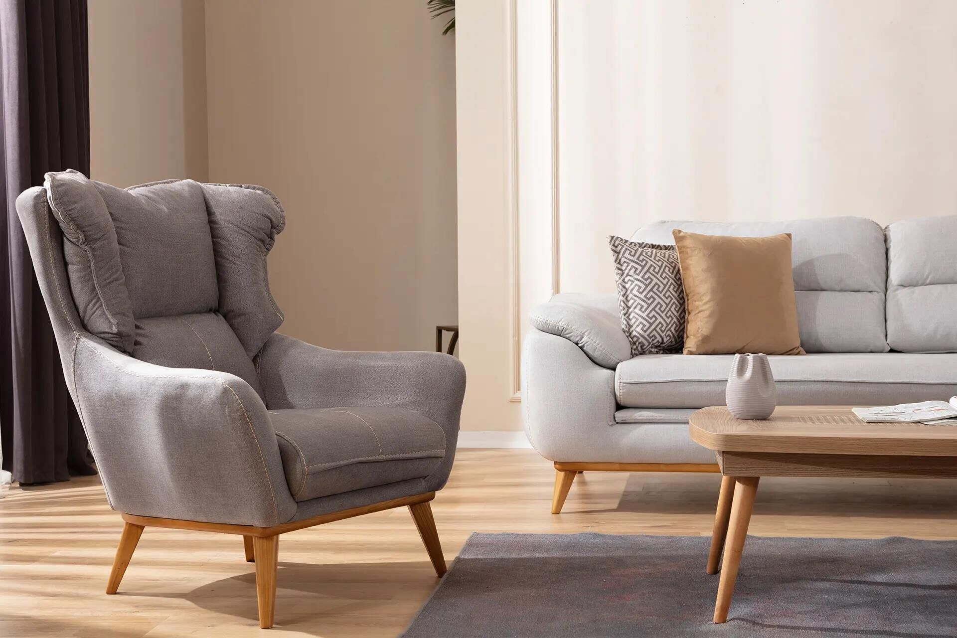 Ahşap detay uygulaması ve çağdaş kumaş kombinasyonları