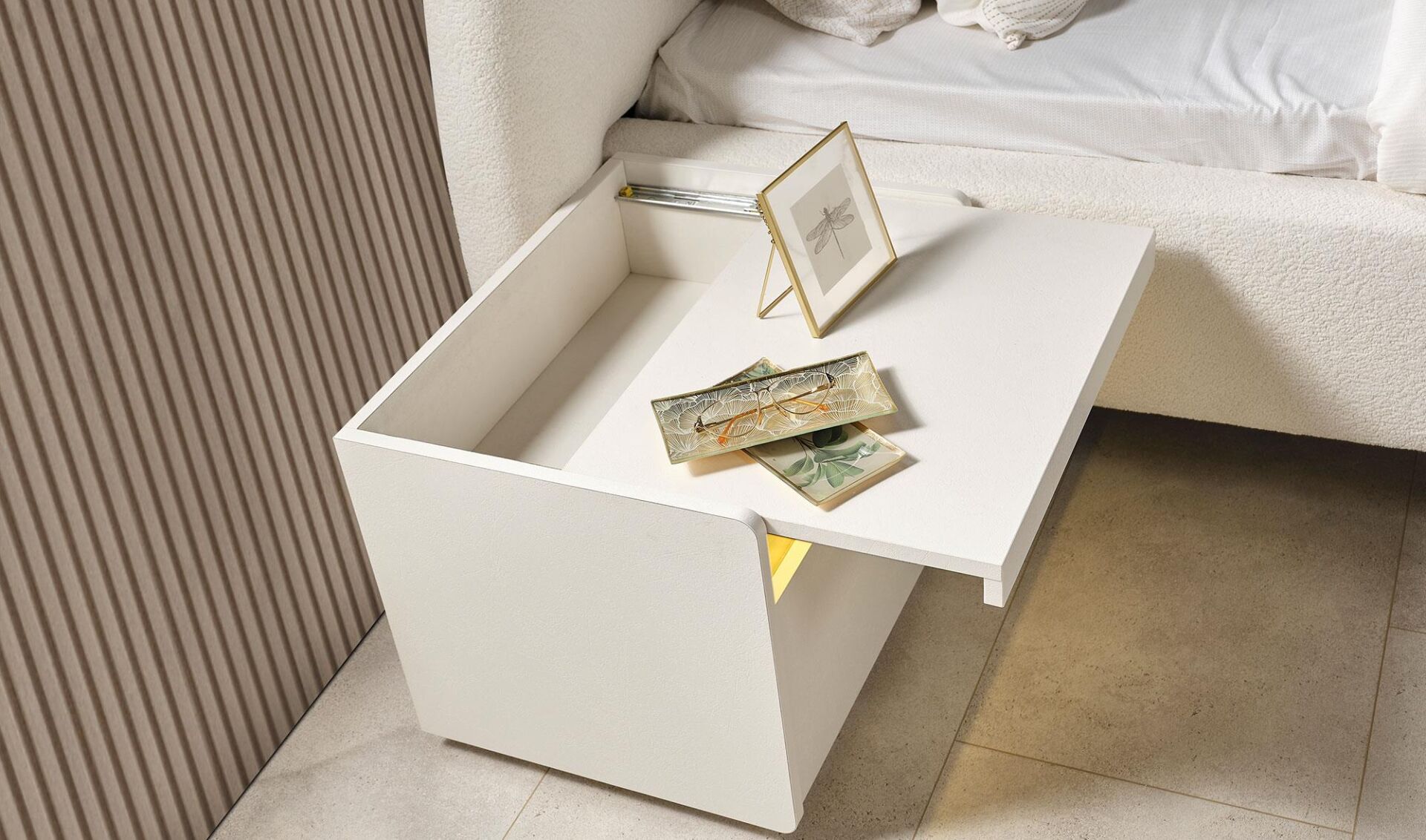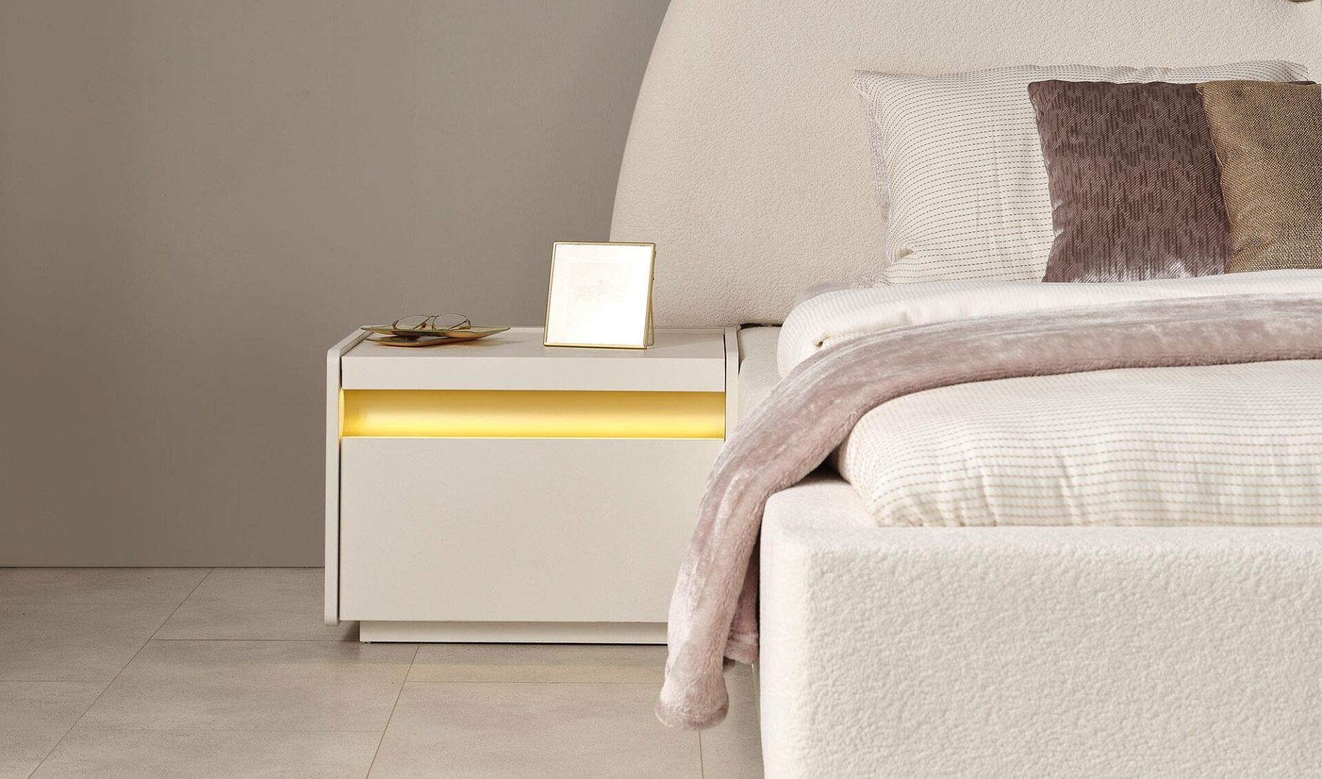 Ön ve üst yüzler, MDF malzeme üzeri lake boya ile üretilmiştir. Led ışıklı aplikler