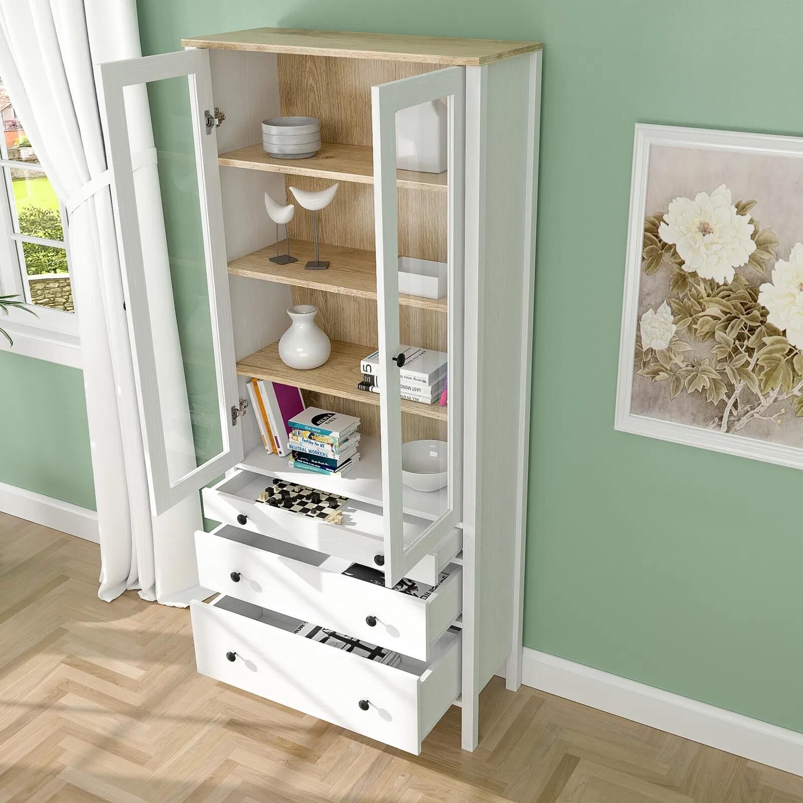 Renk: Mat beyaz dış gövde, doğal ahşap iç panel, üst tabla ahşap desen