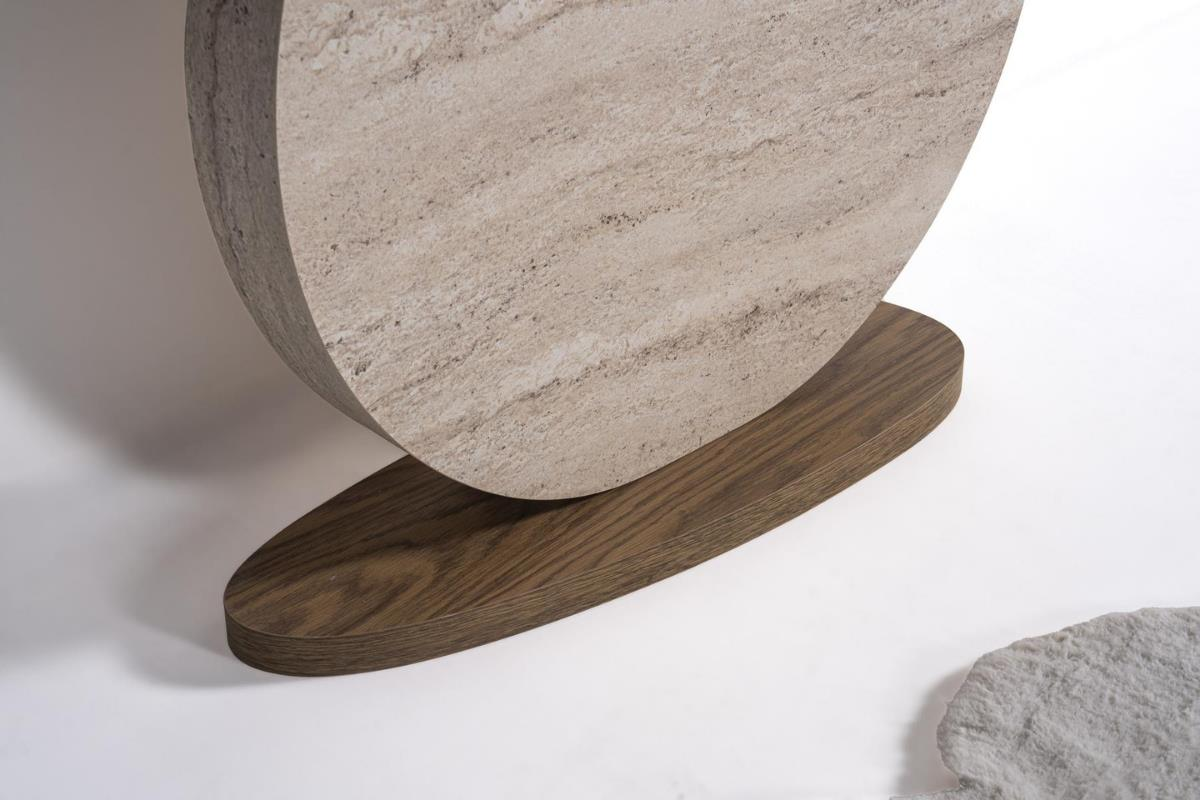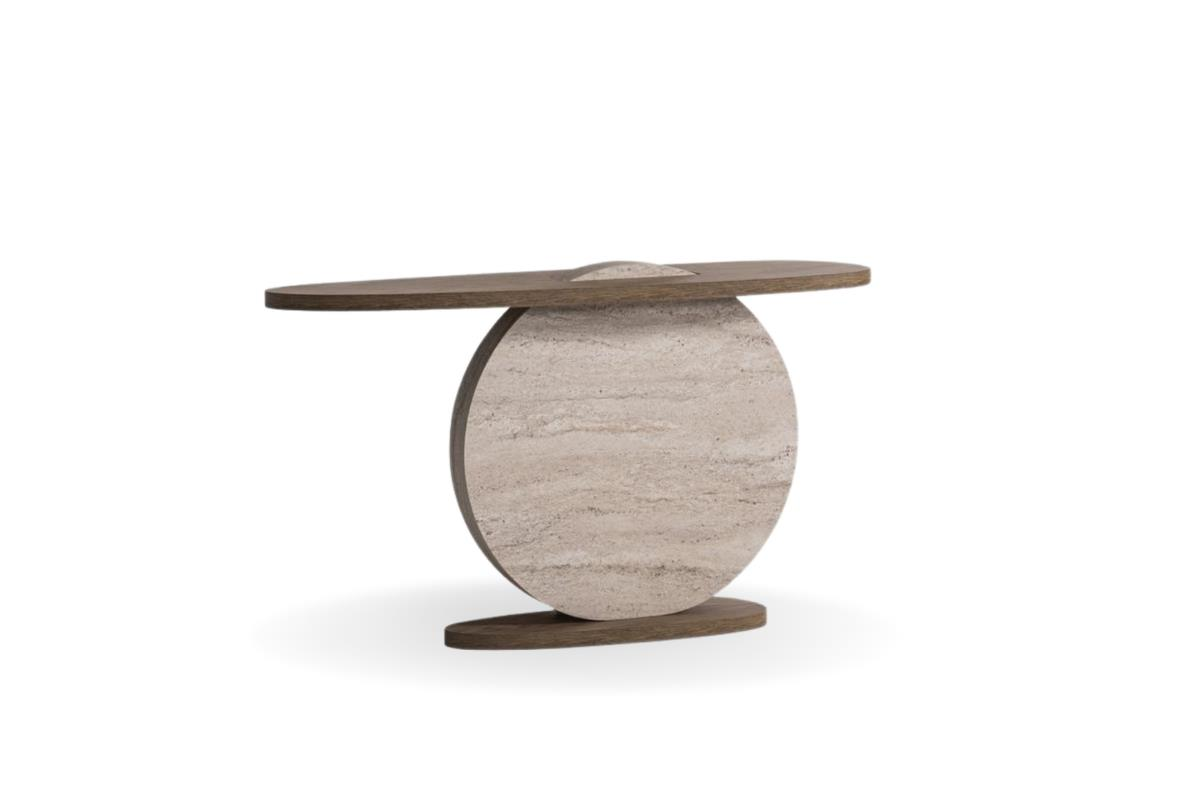 Traverten dokusunun doğal sıcaklığını heykelsi daire formuyla buluşturan Milano Zirve Traverten Dresuar,